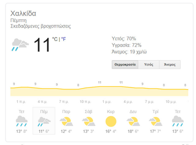 Στον πίνακα κάτω μπορείτε να δείτε αναλυτική πρόγνωση για τον καιρό στη Χαλκίδα: