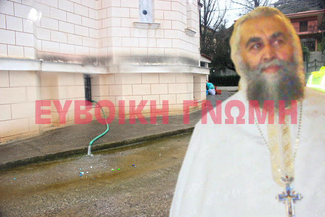 Ο π. Γιώργος Μωραΐτης (ένθετη φωτό) απομάκρυνε με λάστιχα τα νερά από την εκκλησία.