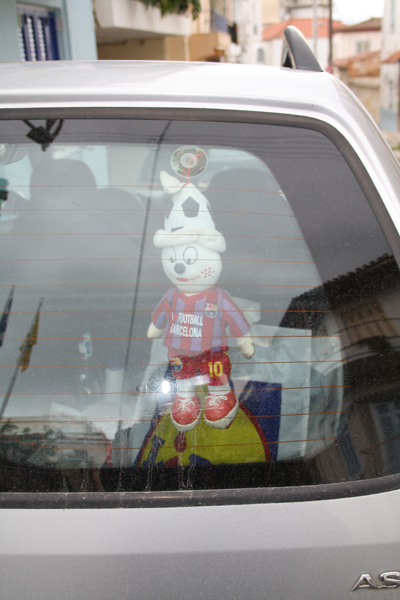 Κουκλάκι Μπάρτσα κολλημένο στο πίσω μέρος του παρ-μπριζ, που, εκτός των άλλων μπορεί να σημαίνει ότι ο οδηγός παίζει και "καλή μπάλα" στους δρόμους!