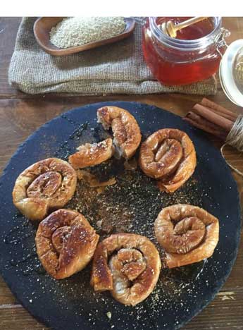 Ζεσταίνουμε σε κατσαρόλα το μέλι να αραιώσει. Περιχύνουμε τις πίτες με το μέλι, αφού κρυώσουν και πασπαλίζουμε με κανέλα και σουσάμι.