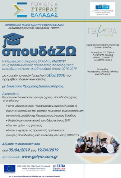 Την παροχή έκτακτης οικονομικής ενίσχυσης σε πρωτοετείς προπτυχιακούς φοιτητές- σπουδαστές του ακαδημαϊκού έτους 2018-2019, μέλη οικογενειών της Περιφέρειας Στερεάς Ελλάδας, που διαβιούν κάτω από τα όρια της φτώχειας, ανακοίνωσε ο Περιφερειάρχης Κώστας Μπακογιάννης.