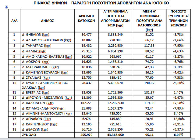 Όπως φαίνεται και στο σχετικό πίνακα, «πρωταθλητής» στην παραγωγή απορριμμάτων ανά κάτοικο είναι ο Δήμος Κύμης Αλιβερίου με 190 κιλά ανά κάτοικο και ακολουθεί ο Δήμος Ερέτριας με 131 κιλά.