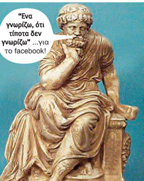 Aν λοιπόν, ζούσε σήμερα ο Σωκράτης, δεν αποκλείεται να ήταν κολλημένος στην TV ή σε κάποιο διαδικτυακό παιχνίδι. Nα έκανε "add" τον Πλάτωνα στο facebook και αντί για τα περίφημα "Συμπόσια" να μαζεύονταν online και να έπαιζαν poker στο διαδίκτυο. Tουλάχιστον έτσι ο Σωκράτης θα έπινε freddo ή mohito και όχι κώνειο!