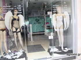 Η βιτρίνα του καταστήματος BODY'S, στην οδό Κριεζώτου, σίγουρα τραβάει την προσοχή. Η έμπνευση του ντεκορατέρ να βάλει φτερά αγγέλου στις κούκλες με τα σέξι εσώρουχα ...κολάζει και καλόγερο!