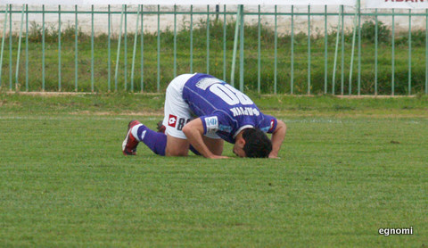 Δεν άργησε να έρθει και το δεύτερο γκολ για τους γηπεδούχους. οκτώ λεπτά αργότερα ο Φαρούκ εκμεταλλεύτηκε το λάθος στην άμυνα των Χανίων και με θαυμάσιο σουτ ανάγκασε τους αντιπάλους να τον ...προσκυνήσουν και μετά ό ίδιος προσκύνησε για να ευχαριστήσει το Θεό (φωτό).