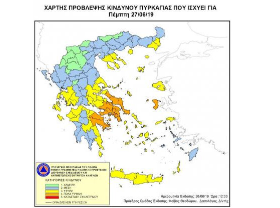 Με κατάσταση πολύ υψηλού κινδύνου πυρκαγιάς, (κατηγορία 4), θα κυλήσει η μέρα και την Πέμπτη 27 Ιουνίου, για Αττική, Βοιωτία, Εύβοια, Αργολίδα, Κορινθία και Χίο, σύμφωνα με το Χάρτη Πρόβλεψης Κινδύνου Πυρκαγιάς που εκδίδει καθημερινά η Γενική Γραμματεία Πολιτικής Προστασίας.