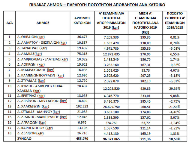Η συνολική παραγωγή αστικών στερεών αποβλήτων ανήλθε για το 1o εξάμηνο του έτους 2019 σε 96.371.865 kgr. Η παραγωγή αποβλήτων ανά Δήμο και κάτοικο φαίνεται στον παρακάτω πίνακα: