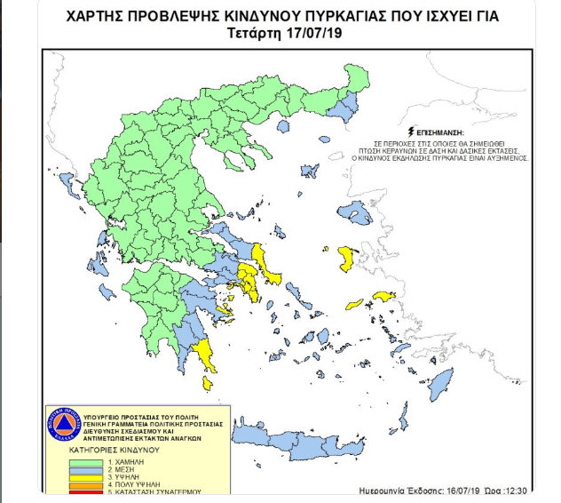 Σύμφωνα με τον Χάρτη Πρόβλεψης Κινδύνου Πυρκαγιάς που ισχύει για την Τετάρτη 17.7.2019, προβλέπεται Υψηλός κίνδυνος πυρκαγιάς για Αττική, Μέθανα, νησιά Σαρωνικού, Νότιο Εύβοια, Χίο, Σάμο, Ικαρία, Κύθηρα και Λακωνία.