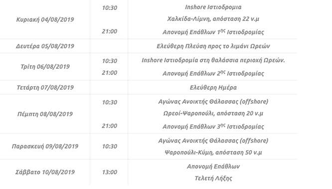 Σύμφωνα με το πρόγραμμα που μπορείτε να δείτε πιο κάτω, την Δευτέρα 5 Αυγούστου έχουμε ελεύθερη θαλασσοπορία από τη Λίμνη στους Ωρεούς και στις 6 Αυγούστου θα διεξαχθεί η δεύτερη ιστιοδρομία ελεγχόμενου στίβου.