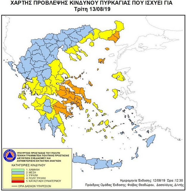 Σύμφωνα με τον Χάρτη Πρόβλεψης Κινδύνου Πυρκαγιάς που ισχύει για την Τρίτη 13 Αυγούστου, πολύ υψηλός είναι ο κίνδυνος πυρκαγιάς σε Αττική, Βοιωτία, Φθιώτιδα, Εύβοια, Σκύρο, Σποράδες, Λήμνο, Σαμοθράκη,Έβρο,Κορινθία και Αργολίδα.