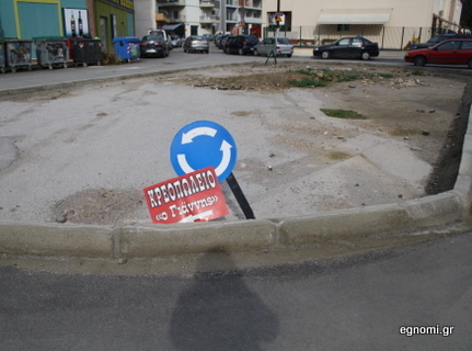 Εδω, λοιπόν, είμαστε στην οδό Μεγασθένους, όπου η πινακίδα για την κυκλική κατεύθυνση των οχημάτων στην πλατεία έχει βρεθεί ίσα με το δάπεδο για κάποιο λόγο.