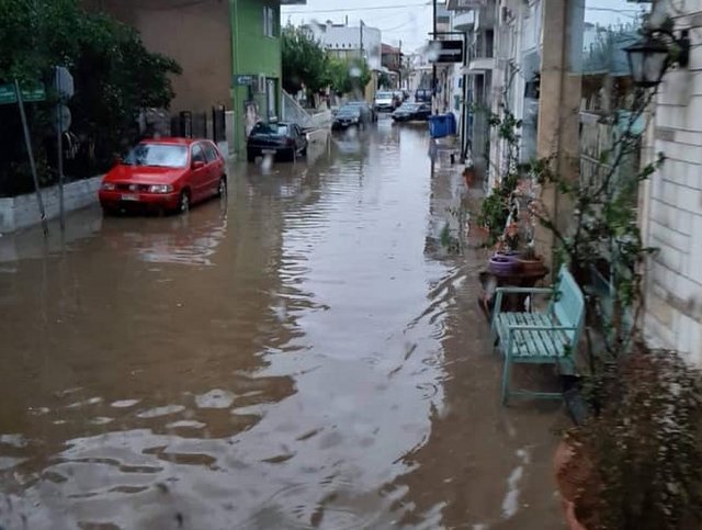 Εκτός από τη χαλαζόπτωση και η βροχόπτωση ήταν ιδιαίτερα έντονη. Το νερό ήταν πάρα πολύ και οι δρόμοι πλημμύρισαν (φωτό κάτω).