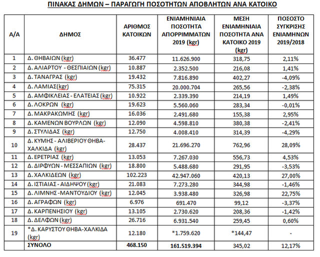 Η συνολική παραγωγή αστικών στερεών αποβλήτων ανήλθε για τους πρώτους εννέα μήνες του έτους 2019 σε 161.519.394 κιλά. Πρωταθλητές στην παραγωγή απορριμμάτων παραμένουν οι κάτοικοι των Δήμων Κύμης-Αλιβερίου και Ερέτριας, ο οποίοι παράγουν τα περισσότερα απορρίμματα ανά κάτοικο.