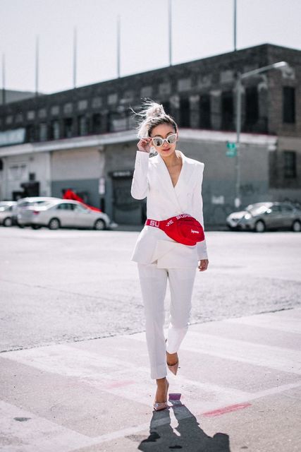 Επίσης, μπορείς να φορέσεις το λευκό σου κοστούμι ακόμα και με sneakers και belt bag, όπως το έχουμε δει σε πολλές φωτογραφίες fashionista.