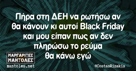 Πάω σήμερα φίλε μου σε ένα sex shop και τους ρωτάω «έχετε black friday; και βγαίνε φίλε ένας μαύρος από το βάθος που τον έλεγαν Παρασκευά. Ακόμη τρέχω.....