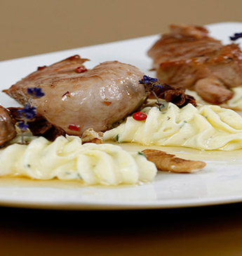 Όταν οι πατάτες είναι έτοιμες, τις στραγγίζετε και τις λιώνετε με πιρούνι ή το ειδικό εργαλείο για πουρέ, μαζί με το γιαούρτι και την κρέμα γάλακτος. Ανακατεύετε μέσα τη ρίγανη και το βασιλικό και ελέγχετε το αλατοπίπερο. Σερβίρετε τα φιλετάκια με τη σάλτσα τους και τα συνοδεύετε με τον αρωματικό πουρέ.