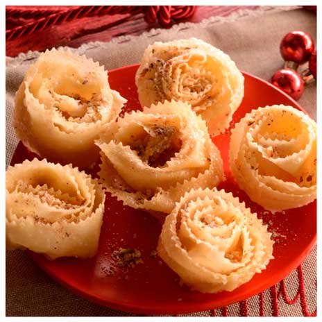Παίρνετε κομμάτια ζύμης και τα ανοίγετε σε λεπτό φύλλο με τη μηχανή για φύλλο. Τα κόβετε σε τετράγωνα κομμάτια ή σε λωρίδες και τις δένετε φιόγκο ή τις τυλίγετε γύρω από το χερούλι μιας κουτάλας σε τριαντάφυλλα. Τηγανίζετε τα ξεροτήγανα σε μπόλικο καυτό λάδι μέχρι να ροδίσουν ελαφρά και τα βγάζετε πάνω σε απορροφητικό χαρτί για να στραγγίσουν.