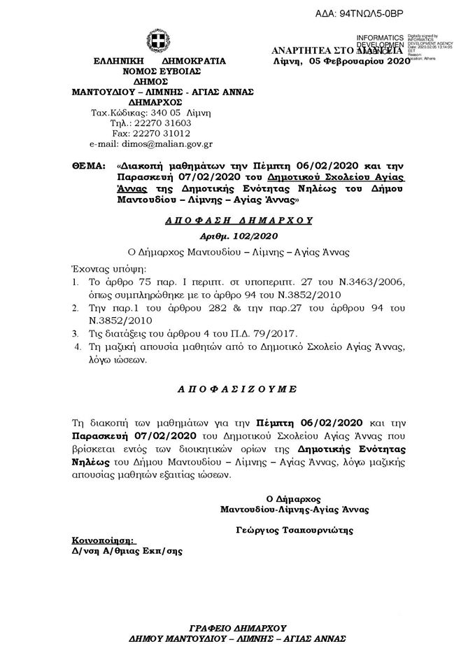 Κλειστό θα μείνει το Δημοτικό Σχολείο Αγ. Άννας την Πέμπτη και την Παρασκευή 7 Φεβρουαρίου, με απόφαση του δημάρχου Γιώργου Τσαπουρνιώτη.