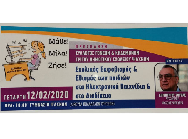 Ο Σύλλογος Γονέων και Κηδεμόνων του 3ου Δημοτικού Σχολείου Ψαχνών διοργανώνει εκδήλωση, που περιλαμβάνει ομιλία με θέμα «Σχολικός Εκφοβισμός και Εθισμός των παιδιών στα Ηλεκτρονικά Παιχνίδια και στο Διαδίκτυο».