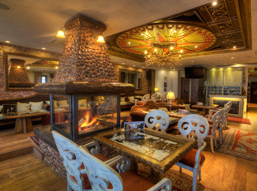 Σε όλη τη διακόσμηση, όπως και στη σάλα του κυριαχεί έντονα το στοιχείο του ξύλου και της πέτρας, προσφέροντας στον επισκέπτη διαχρονική πολυτέλεια.