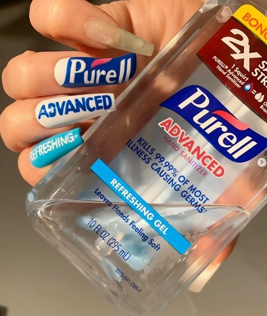 Ολη αυτή η κατάσταση που επικρατεί τις τελευταίες μέρες έγινε πηγή έμπνευσης για τους nail artists. Συγκεκριμένα, η γνωστή για τα extreme nail looks celebrity nail artist Mei Kawajiri δημιούργησε ένα μανικιούρ εμπνευσμένο από το αντισηπτικό χεριών που χρησιμοποιεί.
