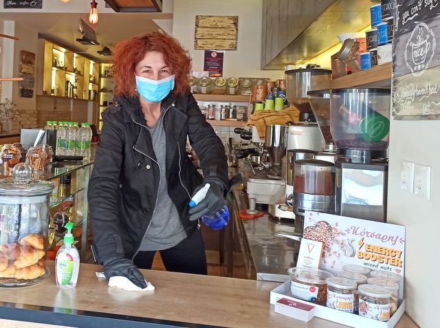 Με μάσκα στο πρόσωπο και γάντια στα χέρια, απολυμαίνει συνέχεια τον πάγκο στο μαγαζί της, για την δική της ασφάλεια και των πελατών της. Μίλησε στο egnomi.gr για το μεροκάματο της αγωνίας, που παίρνει αυτές τις μέρες.