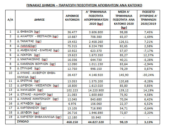 Η συνολική παραγωγή αστικών στερεών αποβλήτων ανήλθε για το Αʼ τρίμηνο του 2020 σε 44.827.320 kgr. Ο Δήμος Κύμης-Αλιβερίου παραμένει "πρωταθλητής" στην παραγωγή απορριμμάτων ανά κάτοικο, παρόλο που μείωσε σχεδόν στο ένα τρίτο την παραγωγή απορριμάτων σε σχέση με το αντίστοιχο τρίμηνο του 2019.