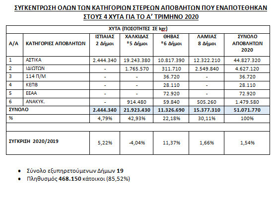 Στους τέσσερις ΧΥΤΑ (Ιστιαίας, Χαλκίδας, Θήβας μαι Λαμίας), αρμοδιότητας του Περιφερειακού Φο.Δ.Σ.Α Στερεάς Ελλάδας Α.Ε εναπόθεσαν απορρίμματα 19 Δήμοι από τους 25 συνολικά της Περιφέρειας.