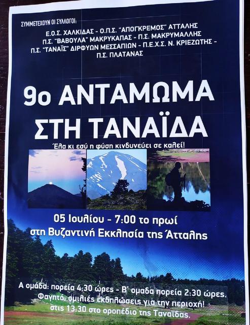 Επτά πολιτιστικοί και φυσιολατρικοί σύλλογοι διοργανώνουν το 9ο αντάμωμα στην Ταναΐδα, την Κυριακή 5 Ιουλίου, πεζοπορία, ορειβασία, φαγητό, ομιλίες και εκδηλώσεις.