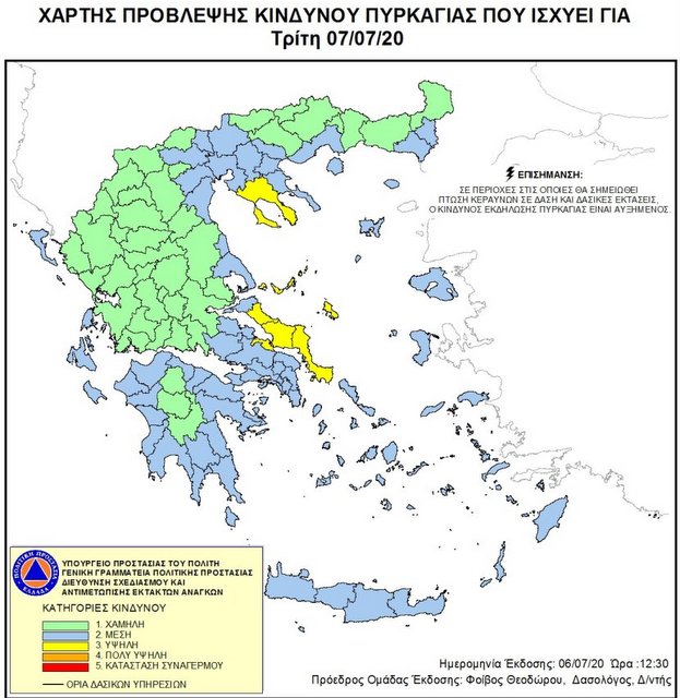 Σύμφωνα με το Χάρτη Πρόβλεψης Κινδύνου Πυρκαγιάς, που εκδίδει η Γενική Γραμματεία Πολιτικής Προστασίας, για την Τρίτη 7 Ιουλίου 2020, προβλέπεται υψηλός κίνδυνος πυρκαγιάς (κατηγορία κινδύνου 3) σε Εύβοια, Σποράδες και Χαλκιδική.
