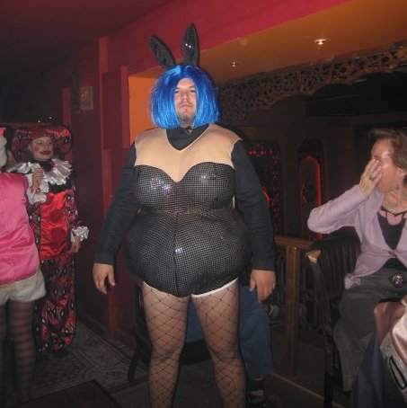 Όχι μόνο φόρεσε το μαύρο κορμάκι του, αλλά το συνδύασε άψογα με δικτυωτό καλσόν, μπλε απαστράπτουσα περούκα και μαύρα μυτερά αυτιά. Σωστό κουνελάκι του Playboy δηλαδή.
