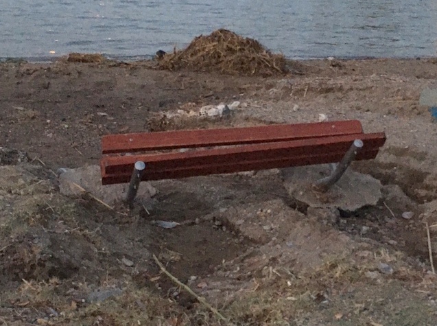 Τρία παγκάκια είχε όλα κι όλα η πλαζ, το ένα το πήρε ...σβάρνα το νερό και βρέθηκε διαλυμένο στη θέση που βλέπετε. Όπως μπορείτε να παρατηρήσετε, ήταν τέτοια η ορμή του νερού, που ξηλώθηκαν οι τσιμεντένιες βάσεις, που στήριζαν το παγκάκι στο έδαφος.