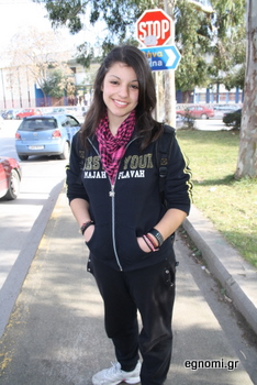 Μάλλον οπαδός του σπορ ντυσίματος είναι η Μαρία και το ίδιο συμβαίνει με την Ματίνα Γκαλούφα (αριστερά), την επόμενη κοπέλα, που μας μίλησε και τόνισε. " Μου αρέσουν τα STAFF σε ρούχα και τα REPLAY από παπούτσια. Μάλιστα φροντίζω να μαζεύω χρήματα από το χαρτζηλίκι μου και στερούμαι άλλα πράγματα, για να ψωνίζω πιο συχνά."