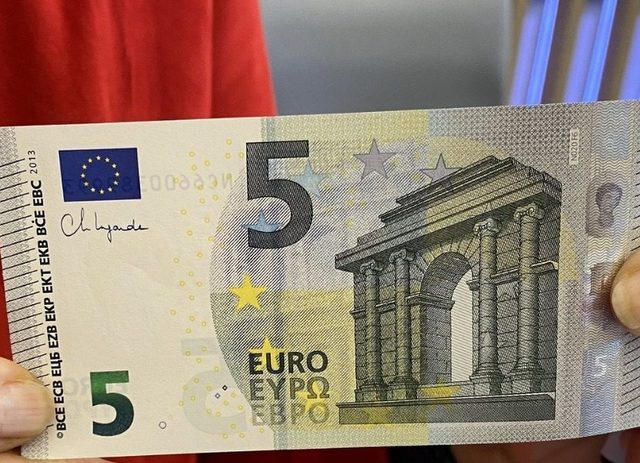Κυκλοφόρησαν τα νέα χαρτονομίσματα των 5 ευρώ, τα οποία, ωστόσο, διαφοροποιούνται από τα προηγούμενα, μόνο και μόνο επειδή φέρουν την υπογραφή της επικεφαλής της Ευρωπαϊκής Κεντρικής Τράπεζας, Κριστίν Λαγκάρντ (αριστερά, κάτω από τη σημαία της Ευρωπαϊκής Ένωσης).