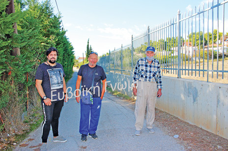 Στηβ Γαλάτουλας, ο Σπύρος Μπούρικας και ο Μανώλης Τσαγκαρουλάκης στη στενή οδό Κολοκοτρώνη που αποτελεί τη μοναδική διέξοδο του οικισμού «Πευκοδάσος-Λιθοσωρός».