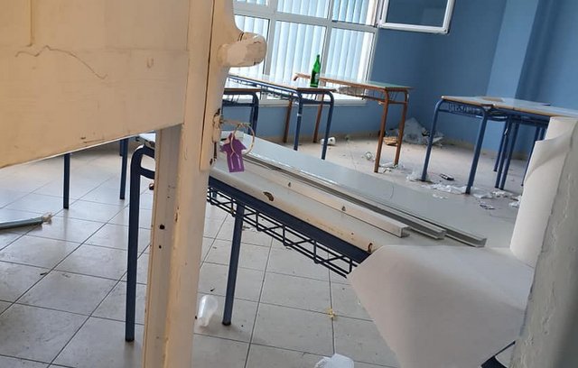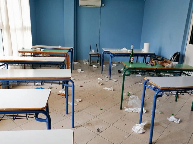 Συγκεκριμένα οι νεαροί έχουν διαρρήξει την πόρτα σε μία αίθουσα στο ισόγειο του σχολείου, μπαίνουν μέσα όποτε γουστάρουν, τρώνε σουβλάκια και πίνουν μπύρες, όπως μαρτυρούν τα απομεινάρια που αφήνουν πίσω τους.