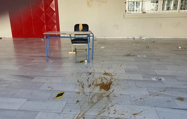Τις σχετικές φωτογραφίες ανάρτησε στον προσωπικό της λογαριασμό στο facebook η λυκειάρχης του σχολείου Μαρία Ματθαίου, η οποία αποκάλυψε ότι έχει κάνει μήνυση στην Αστυνομία για το θέμα, αλλά παρολ' αυτά οι άγνωστοι νεαροί συνεχίζουν τη ...δράση τους.