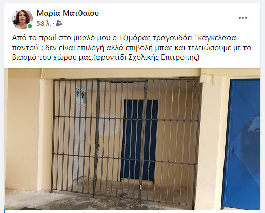 " Από το πρωί στο μυαλό μου ο Τζιμάρας τραγουδάει "κάγκελααα παντού": δεν είναι επιλογή αλλά επιβολή μπας και τελειώσουμε με το βιασμό του χώρου μας.(φροντίδι Σχολικής Επιτροπής)"