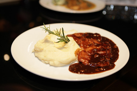 Όταν η σάλτσα δέσει, σερβίρουμε συνοδεύοντας με πουρέ πατάτας και γαρνίρουμε με το φρέσκο δεντρολίβανο.