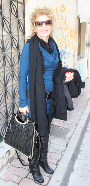 Η Θεοδώρα Χαρίση με μαύρο υφασμάτινο παντελόνι, μπλούζα σε έντονο μπλε, κασκόλ μαύρο χαλαρά ριγμένο γύρω από τους ώμους και το λαιμό, μεγάλη messenger τσάντα που κρατιέται και στο χέρι και γυαλιά ηλίου.