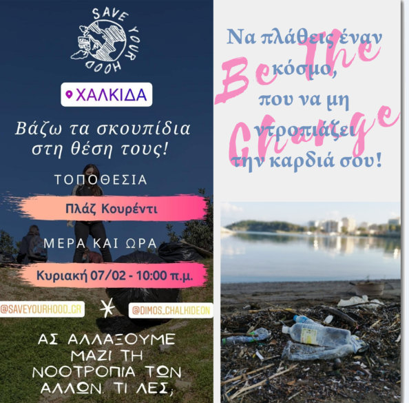H 3η κατά σειρά δράση της ομάδας Save Your Hood Χαλκίδας (η 1η ήταν στην Ιχθυόσκαλα και η 2η στον ποδηλατόδρομο κάτω από την Αγία Μαρίνα) επρόκειτο να πραγματοποιηθεί την Κυριακή 7 Φεβρουαρίου, στις 10 το πρωί, στην πλαζ Κουρέντι, καθώς και στην ευρύτερη περιοχή (Λιμανάκι Καναπίτσας - Παναγία Λαγκαδιώτισσα).