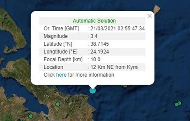 Σεισμός έντασης 3,4 βαθμών της κλίμακας Ρίχτερ σημειώθηκε στην Εύβοια, στις 4:55 τα ξημερώματα της Κυριακής 21 Μαρτίου, χωρίς να γίνει ιδιαίτερα αισθητός, λόγω της χαμηλής έντασης.