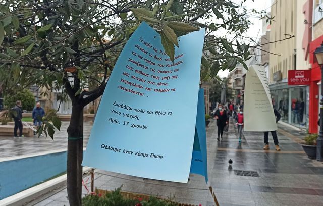 Εκτός από το πανό και τα συνθήματα, που φώναξαν οι εκπαιδευτικοί-μέλη της ΕΛΜΕ Εύβοιας, τοποθέτησαν και σημειώματα των παιδιών στα δένδρα της πλατείας (φωτό κάτω), με σκοπό να ευαισθητοποιήσουν τους Χαλκιδέους.