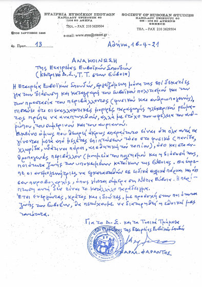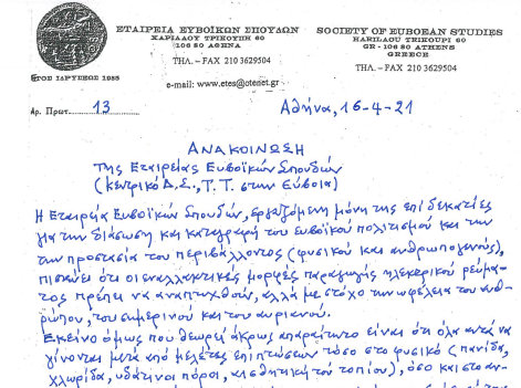 Με μια χειρόγραφη ανακοίνωση, με την υπογραφή του προέδρου της Χαράλαμπου Φαράντου, η Εταιρεία Ευβοϊκών Σπουδών παίρνει θέση για την εγκατάσταση ανεμογεννητριών στην Εύβοια.