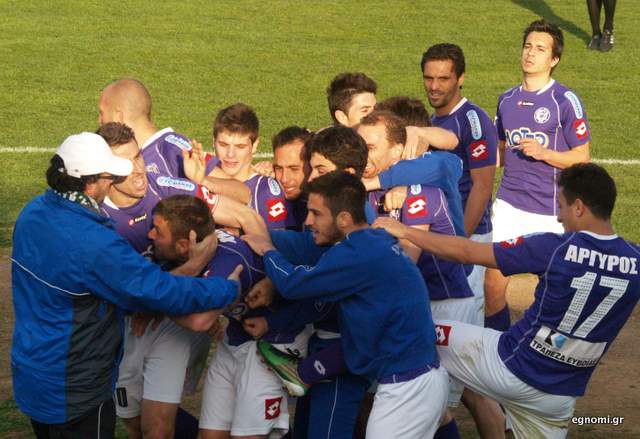 Στις αγκαλιές των συμπαιχτών του ...πνίγηκε ο Βασίλης Ανέστης μετά το χρυσό γκολ που ανέβασε τον Ηρακλή ξανά στην κορυφή της βαθμολογίας, καθώς η Παναχαϊκή (που προηγούταν) έχει ένα ματς λιγότερο (σ.σ.: αγωνίζεται το Σάββατο με τον ΠΑΟ Ρουφ)..