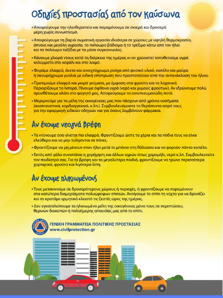 Η Γενική Γραμματεία Πολιτικής Προστασίας (www.civilprotection.gr) του Υπουργείου Προστασίας του Πολίτη, έχει ενημερώσει τις αρμόδιες υπηρεσιακά εμπλεκόμενες κρατικές υπηρεσίες, καθώς και τις περιφέρειες και τους δήμους της χώρας, ώστε να βρίσκονται σε αυξημένη ετοιμότητα πολιτικής προστασίας, προκειμένου να αντιμετωπίσουν άμεσα τις επιπτώσεις από την επικράτηση των υψηλών θερμοκρασιών.