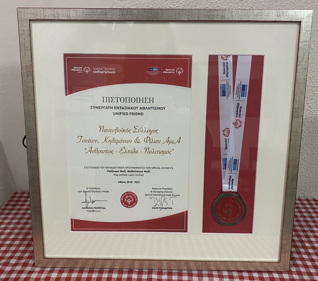 Προς τούτο επιδόθηκε προ ημερών από τον Βαγγέλη Μπλέτσα, συντονιστή-προπονητή του προγράμματος Unified Εύβοιας η πιστοποίηση του συλλόγου μας ως συνεργάτη ενταξιακού αθλητισμού ( UNIFIED FRIEND), η οποία συνοδεύτηκε από εκπαιδευτικό υλικό και συμβολικό δώρο.