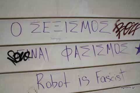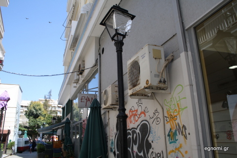 Το πρώτο περίεργο είναι το σύνθημα, που βλέπετε στη φωτό πάνω δεξιά, γραμμένο προφανώς από γυναίκα και μάλιστα αγανακτισμένη. Τα υπόλοιπα περίεργα έχουν να κάνουν με τα φανάρια φωτισμού του δρόμου.