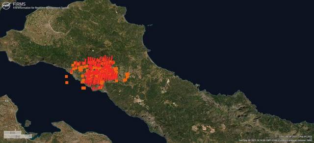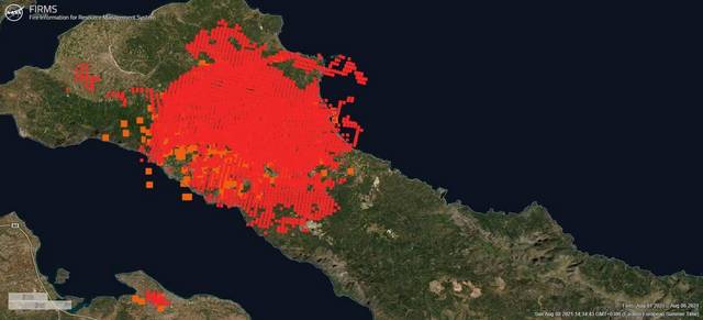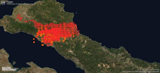 Την τρομακτική εξάπλωση της φωτιάς που ξεκίνησε στην Εύβοια την Τρίτη, παρουσιάζουν οι χάρτες της υπηρεσίας Fire Information for Resource Management System (FIRMS) της NASA.