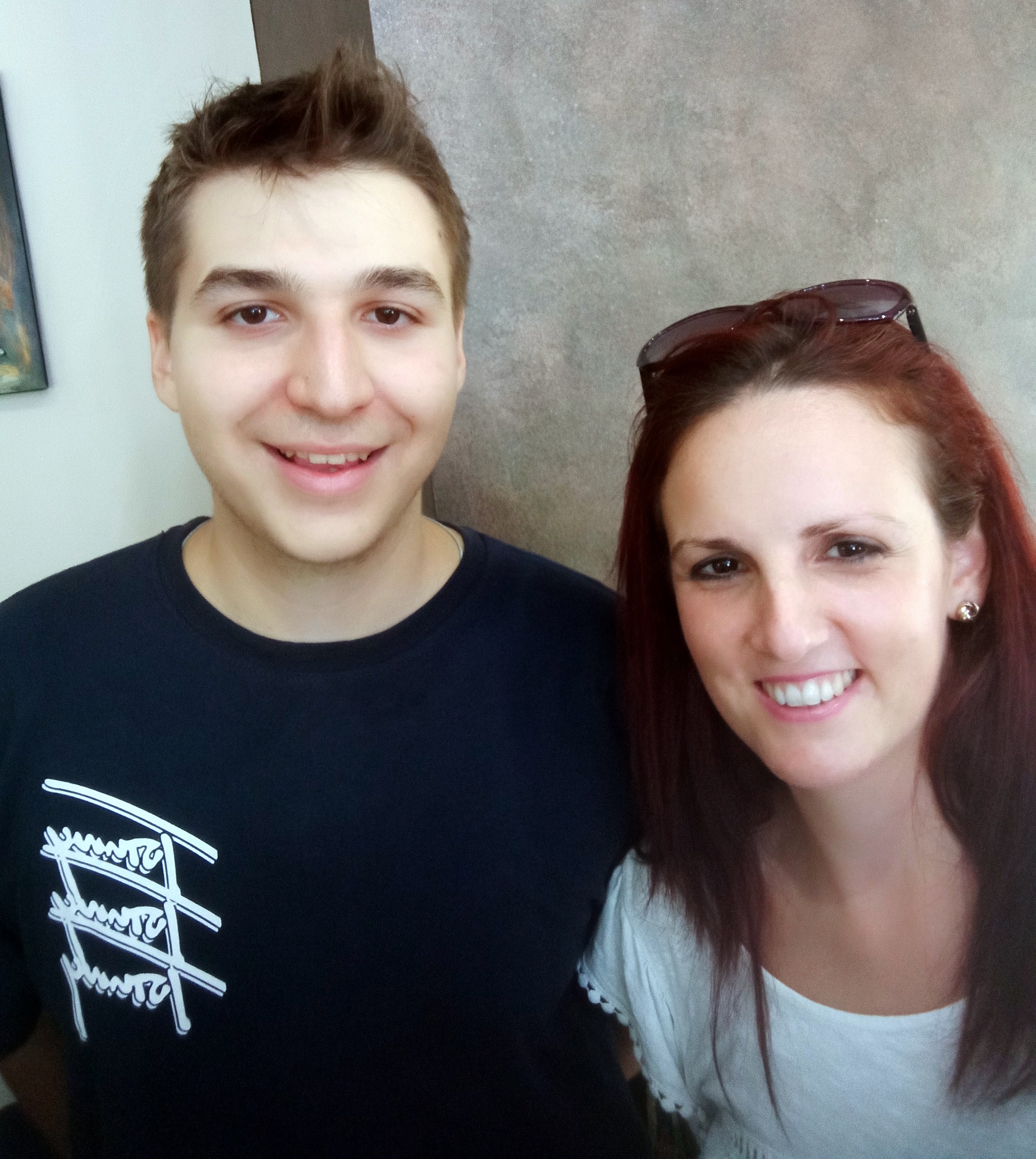 Ο Κωνσταντίνος Τρίκκας χαμογελάει για την επιτυχία του δίπλα στη φιλόλογο και νονά του, Άννα Φραντζή.